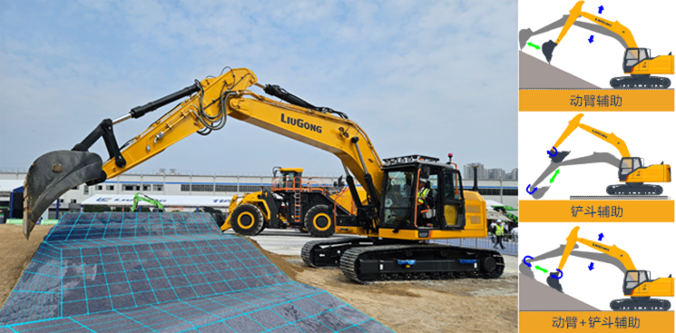 • 动臂+铲斗辅 助:只需操作斗杆手柄,系统可自主协同控制动臂和铲斗动作,修正与目标作业面的偏差,保证铲斗沿目标作业面精准运行。